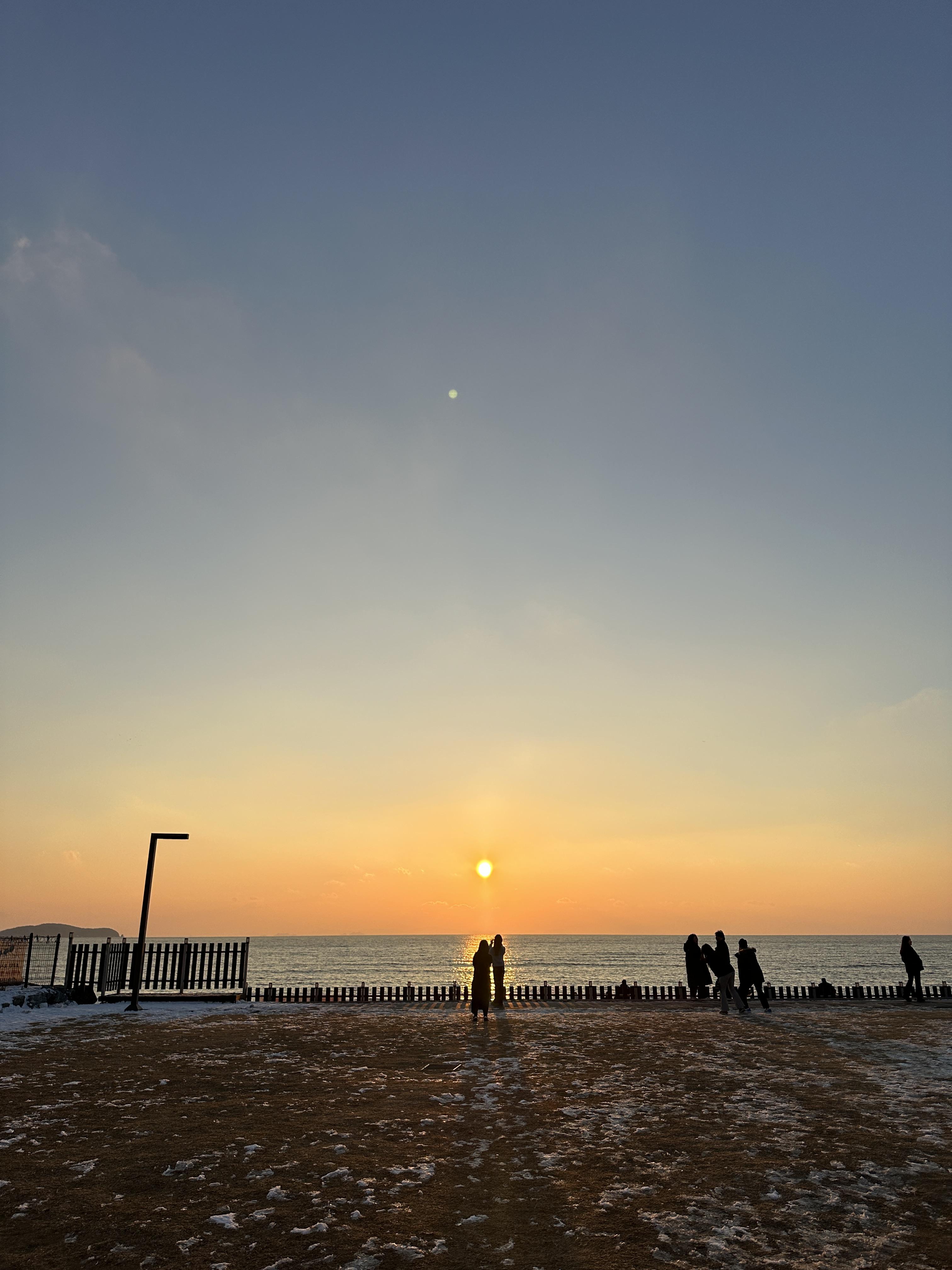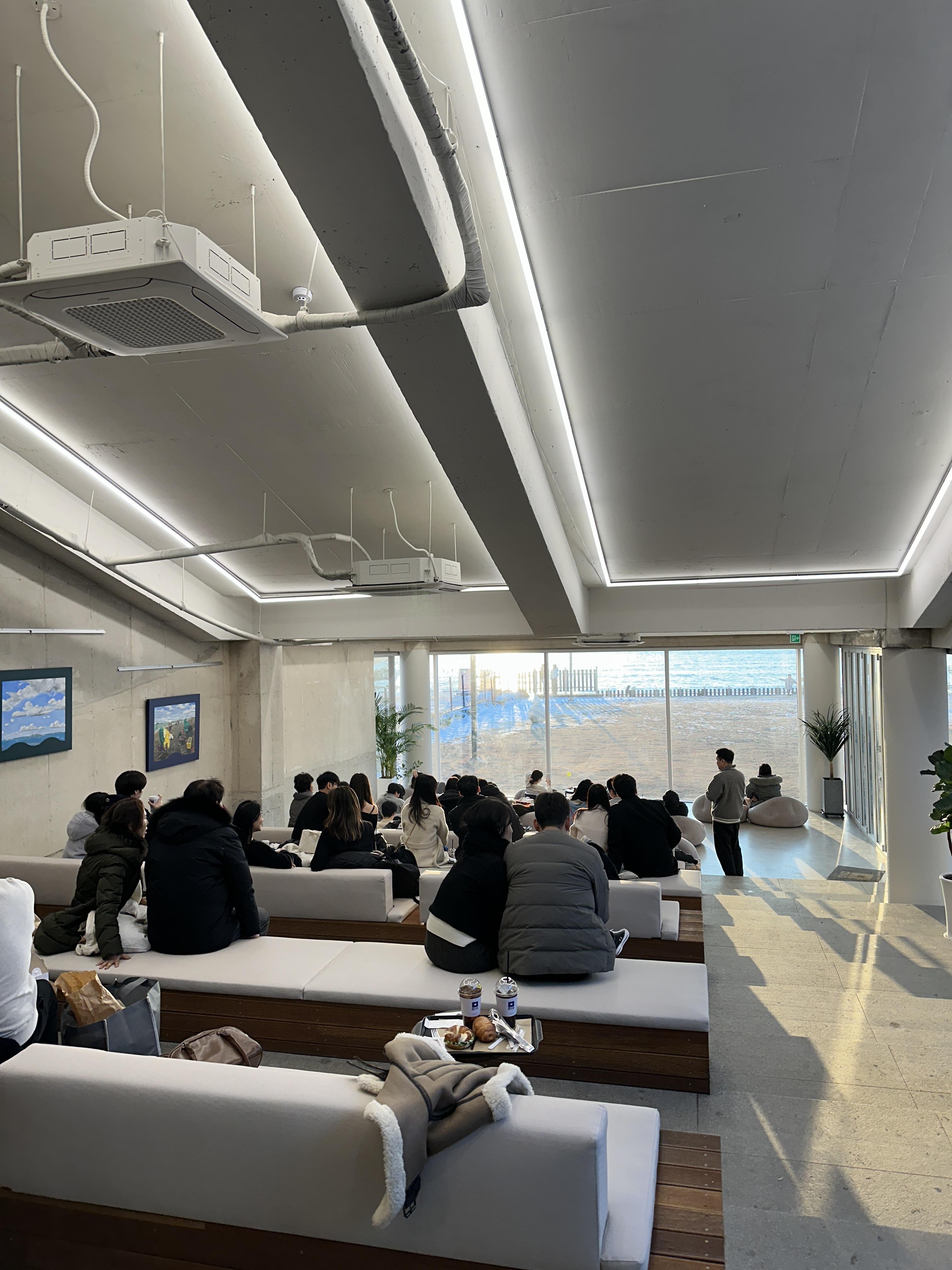 영종도 투어를 마치고 마지막으로 찾아간 카페였다. 어느 건축상을 받은 카페라서 그런지 일반적인 테이블과 의자로 구성된 카페가 아닌 계단식 구조로 큰 통창을 통해 해변을 바라보며 커피를 즐길 수 있는 카페였다.