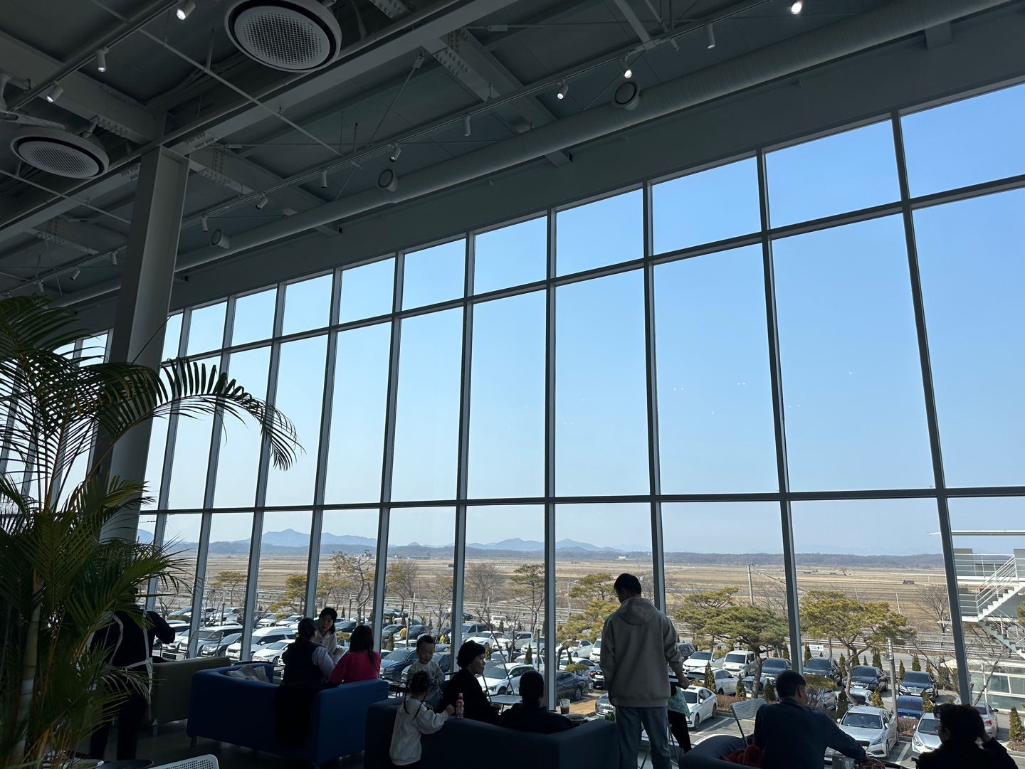 이 카페는 넓은 실내 공간과 높은 층고, 그리고 야자수와 다양한 식물로 꾸며진 내부가 특징인데, 마치 식물원에 온 듯한 느낌을 줍니다. '오랑주리 카페'도 다녀와봤는데 식물 정원은 오랑주리 카페가 더 컸지만, 깔끔함은 문지리535는 오랑주리보다는 식물정원 크기는 작지만, 더 깔끔했어요. 통창 너머로 탁 트인 논밭 뷰와 임진강 방향의 풍경을 감상할 수 있어 ‘논멍’(논을 보며 멍 때리기)과 힐링을 즐기기에 좋습니다. 주차장이 넓게 조성되어 있지만 주말이나 피크 시간대에는 붐비는 경우가 많아 주차와 자리를 확보하려면 일찍 방문하는 것이 추천됩니다. 영업 시간은 보통 오전 10시부터 오후 8시까지이며, 화요일은 정기 휴무일입니다.