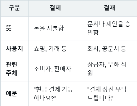 쉽게 말하면, 결제는 지갑이 열리는 상황, 결재는 도장이 찍히는 상황이라고 생각하시면 됩니다! 헷갈릴 때 문맥을 보면 금방 구분할 수 있어요.