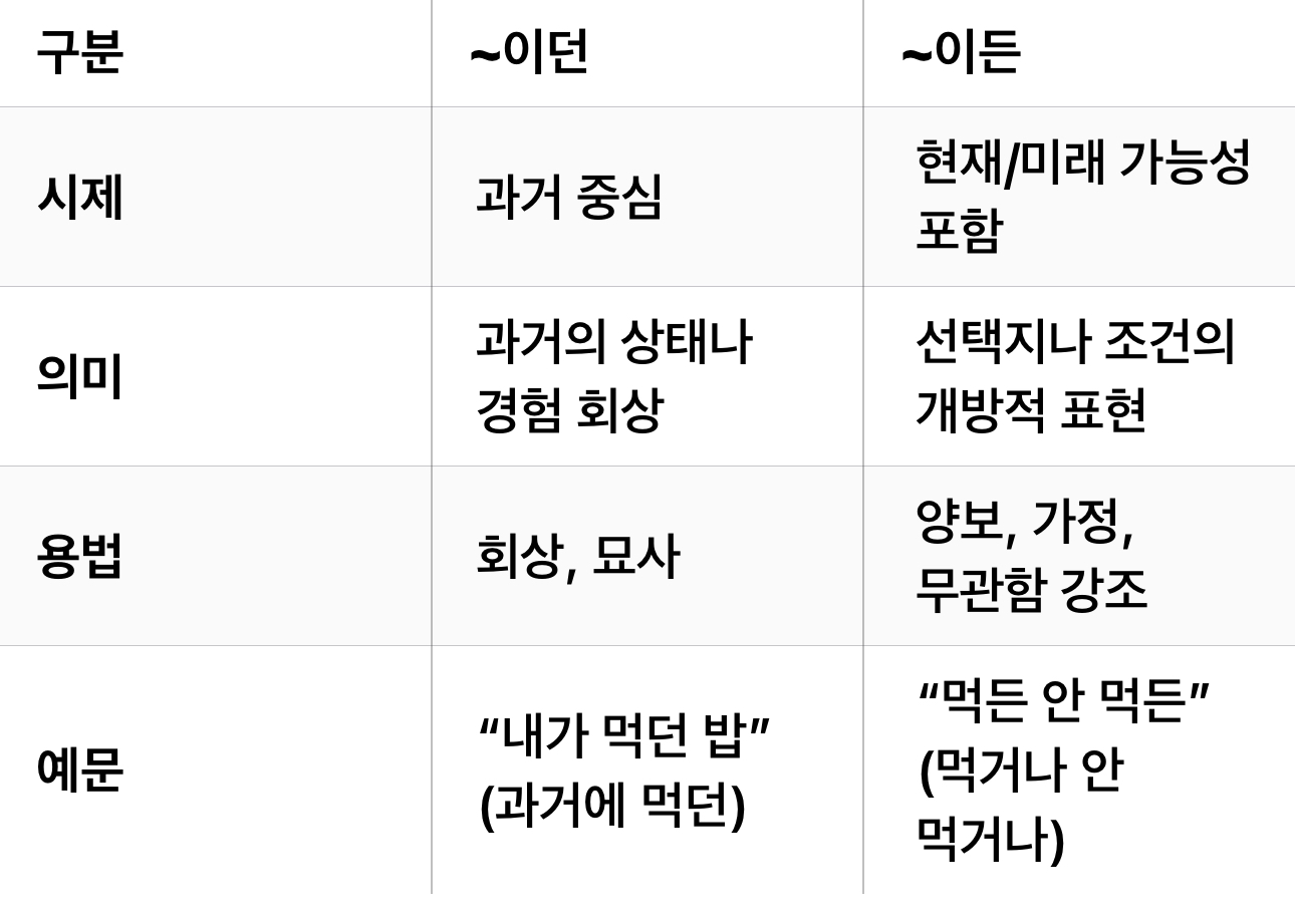 마지막으로 "~던"은 주로 이야기나 추억을 말할 때, "~든"은 선택이나 무관함을 강조할 때 사용된다고 생각하면 구분하기 쉽습니다.