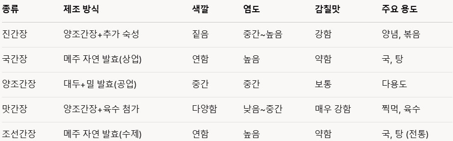 - 제조 과정: 조선간장은 전통 수제 방식, 국간장은 그 상업화 버전, 양조간장은 현대 공업 방식, 진간장은 양조간장의 강화판, 맛간장은 조미 추가형.