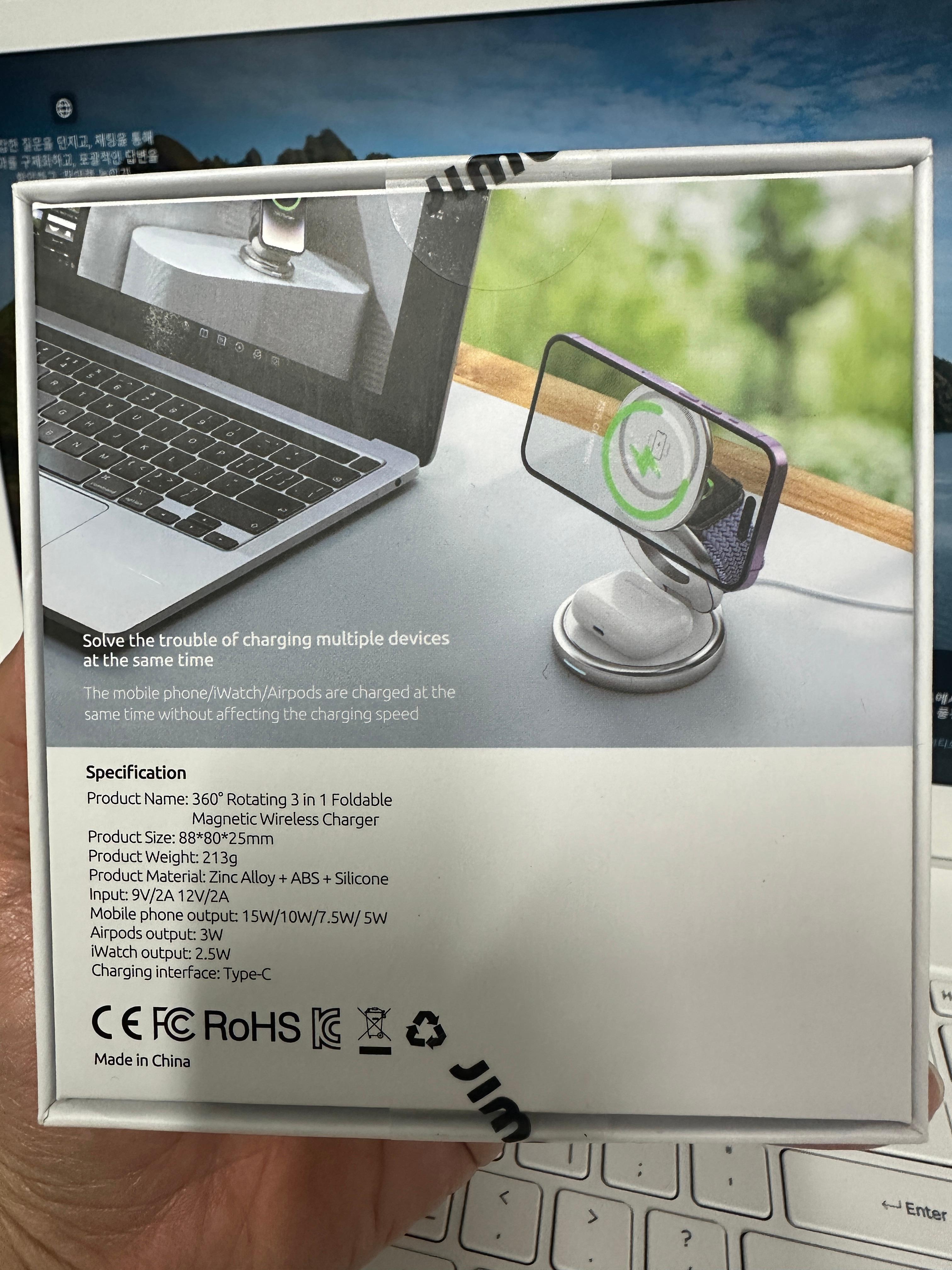 - 제품명: 지모 베이직 3 in 1 360도 고속 맥세이프 충전기 (정확한 모델명은 판매처에 따라 다를 수 있음)