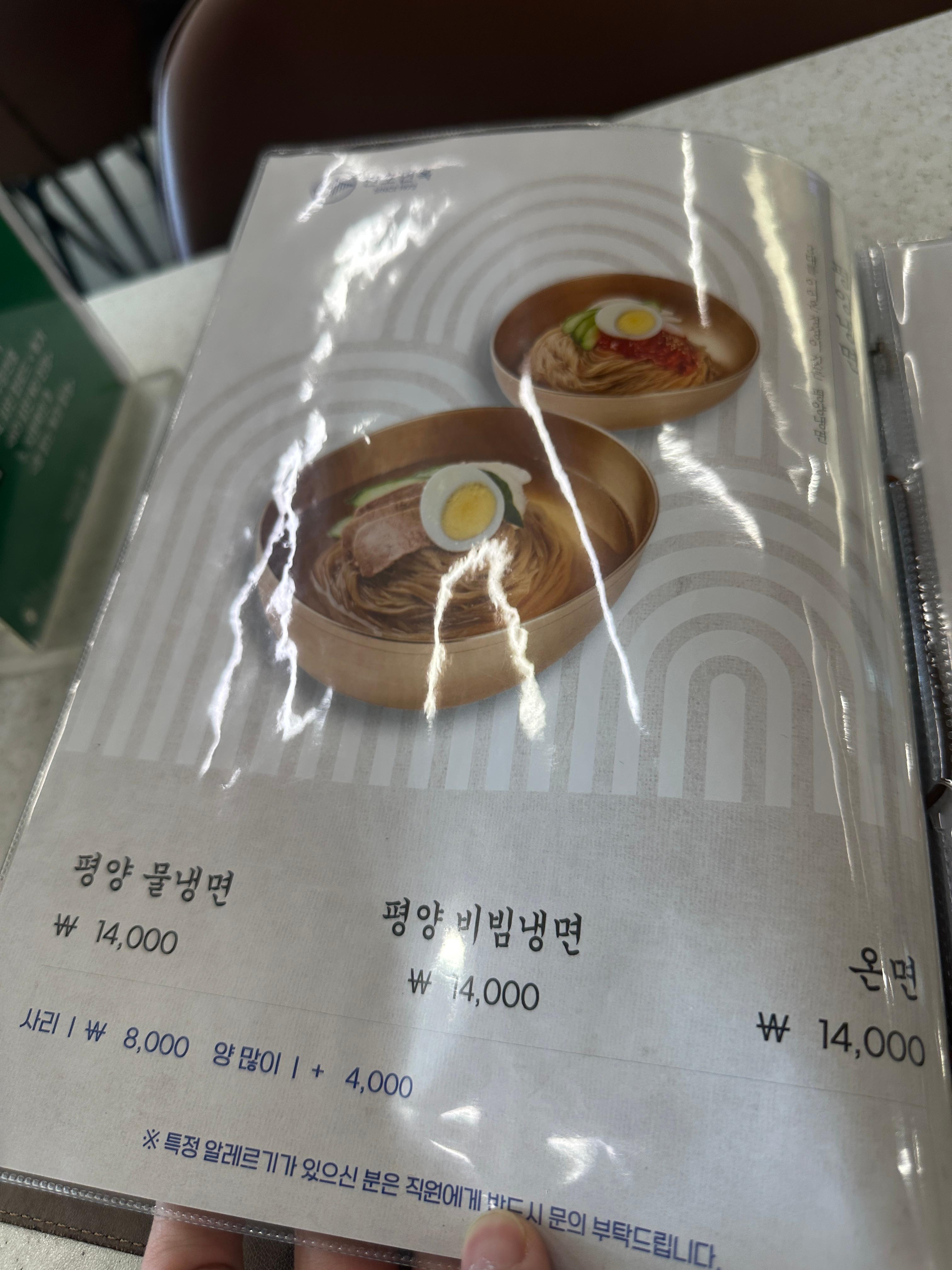 메뉴판을 보고 느낀거지만, 냉면 외에도 어복쟁반, 갈비탕, 만두전골 등 이북식 메뉴가 풍부해요. 그래서 매니아들이 단순히 냉면만 즐기는 데 그치지 않고 다양한 맛을 탐닉할 수 있는 곳 입니다. 반면, ‘옥류관’ 스타일의 정통성을 따르는 일부 식당은 냉면에만 집중하는 경향이 있어 선택의 폭에서 차이가 나기도 합니다.