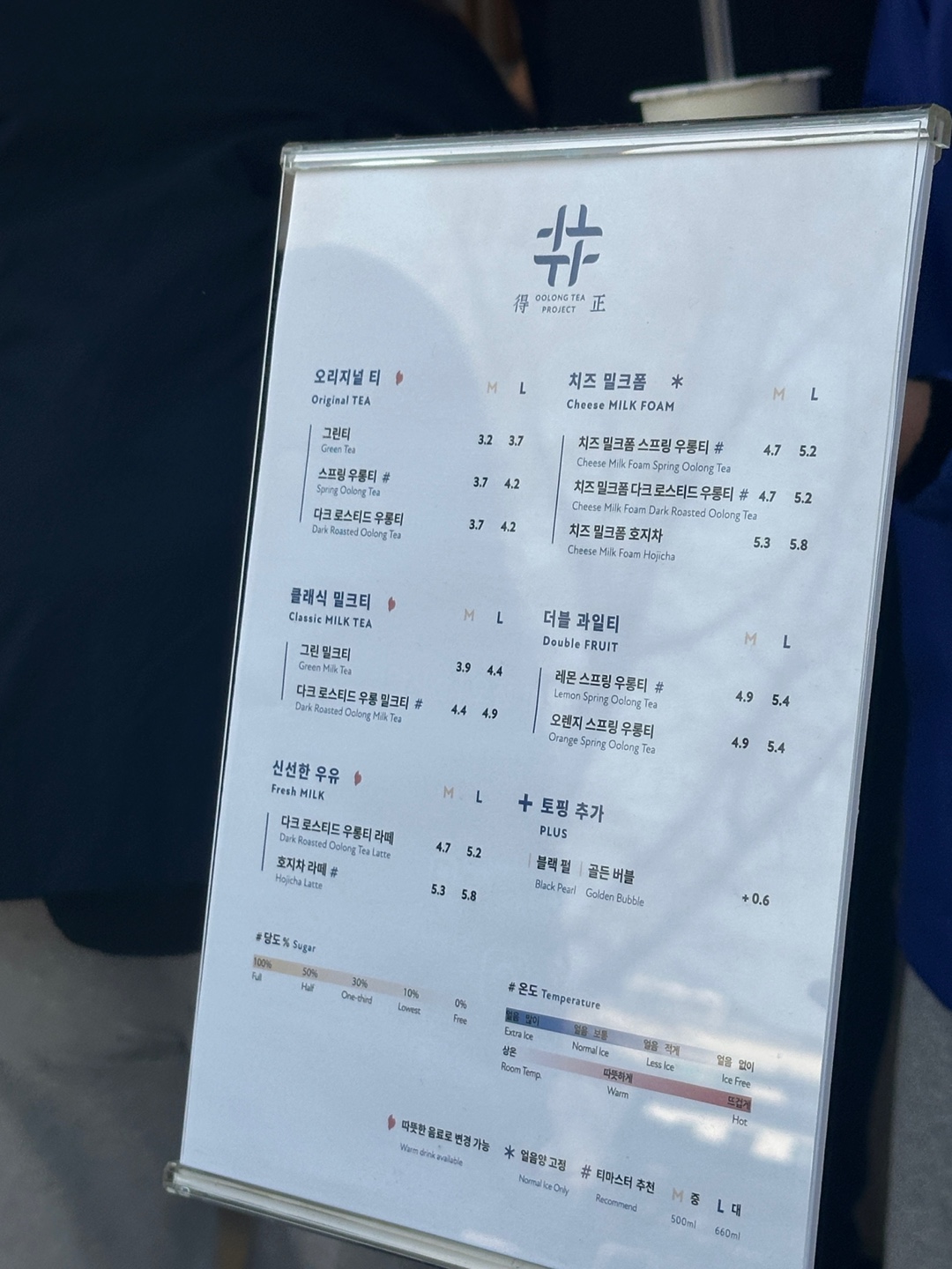 - 초심자인 저라서 어떤게 좋을지 몰라서 검색해보니, ‘레몬 스프링 우롱’(스프링 우롱차에 레몬을 더한 음료)이나 ‘다크 로스티드 우롱 밀크티’를 추천 주었는데, 레몬 스프링 우롱은 상큼함이 더해져 부담 없고, 다크 로스티드 우롱 밀크티는 진한 차 향과 달콤한 조화가 매력적이라고 합니다. 하지만, 전 매장 앞에서 생각을 바꿔서 '치즈 밀크폼 다크 로스티드 우롱티' 와 '스프링 우롱티'를 주문 했습니다. '치즈 밀크폼 다크 로스트티드 우롱티'는 우롱차 위에 폭신한 폼이 올라가있어요. 이 폼이 치즈와 같이 약간 짭쪼름한 맛을 내더라구요. 유제품을 그닥 좋아하지 않는 저로써는 아쉬움이 있는 메뉴였습니다. 참고로, 치즈폼 메뉴는 얼음량이 고정되어 있다고 하네요. '스프링 우롱티'는 기본적인 우롱차이지만, 차의 텁텁한 맛보다는 가볍게 즐길 수 있는 차로 느껴졌습니다. 모든 티들은 당도 30% 이하, 얼음 적게로 주문하면 차 본연의 맛을 더 잘 느낄 수 있습니다.