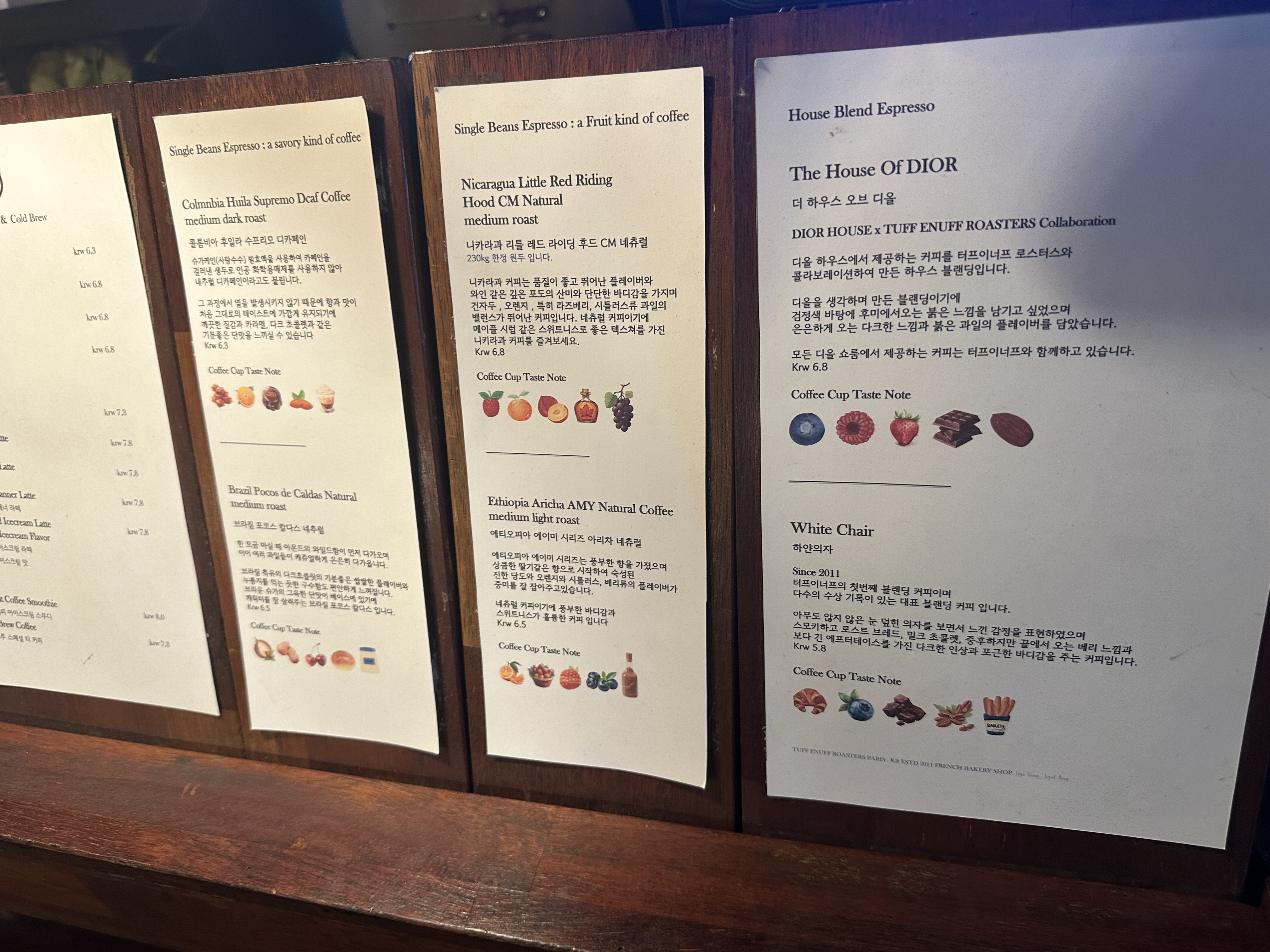 터프이너프는 로스터리 카페로서 커피의 본질에 집중합니다. 싱글 오리진, 핸드드립, 에스프레소 머신 추출 등 다양한 추출 방식과 함께 자체 블렌드 커피(‘3월’, ‘바람’, ‘하얀 의자’ 등 서정적인 이름으로 제공)는 원두의 개성과 바리스타의 철학을 드러냅니다. 이 중에 ‘하얀의자’가 산미가 좀 덜하다고 하니 참고하세요!