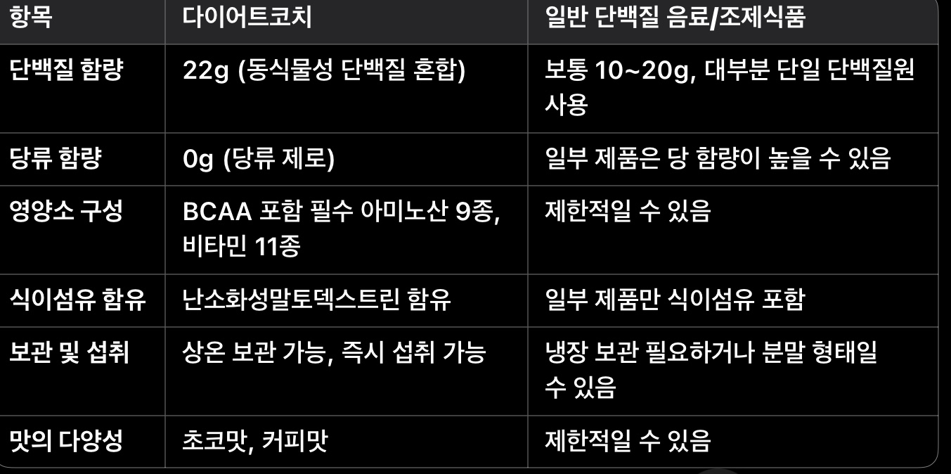 종근당건강의 ‘다이어트코치’는 체중 감량이나 유지 중인 분들에게 균형 잡힌 영양 섭취와 편리한 섭취 방법을 제공하는 제품으로, 기존의 단백질 음료나 체중조절용 조제식품과는 차별화된 특징을 가지고 있습니다. 특히, 당류 제로 설계와 고단백질 함량, 다양한 영양소 구성은 체중 조절을 원하는 분들에게 큰 도움이 될 것 같네요.
