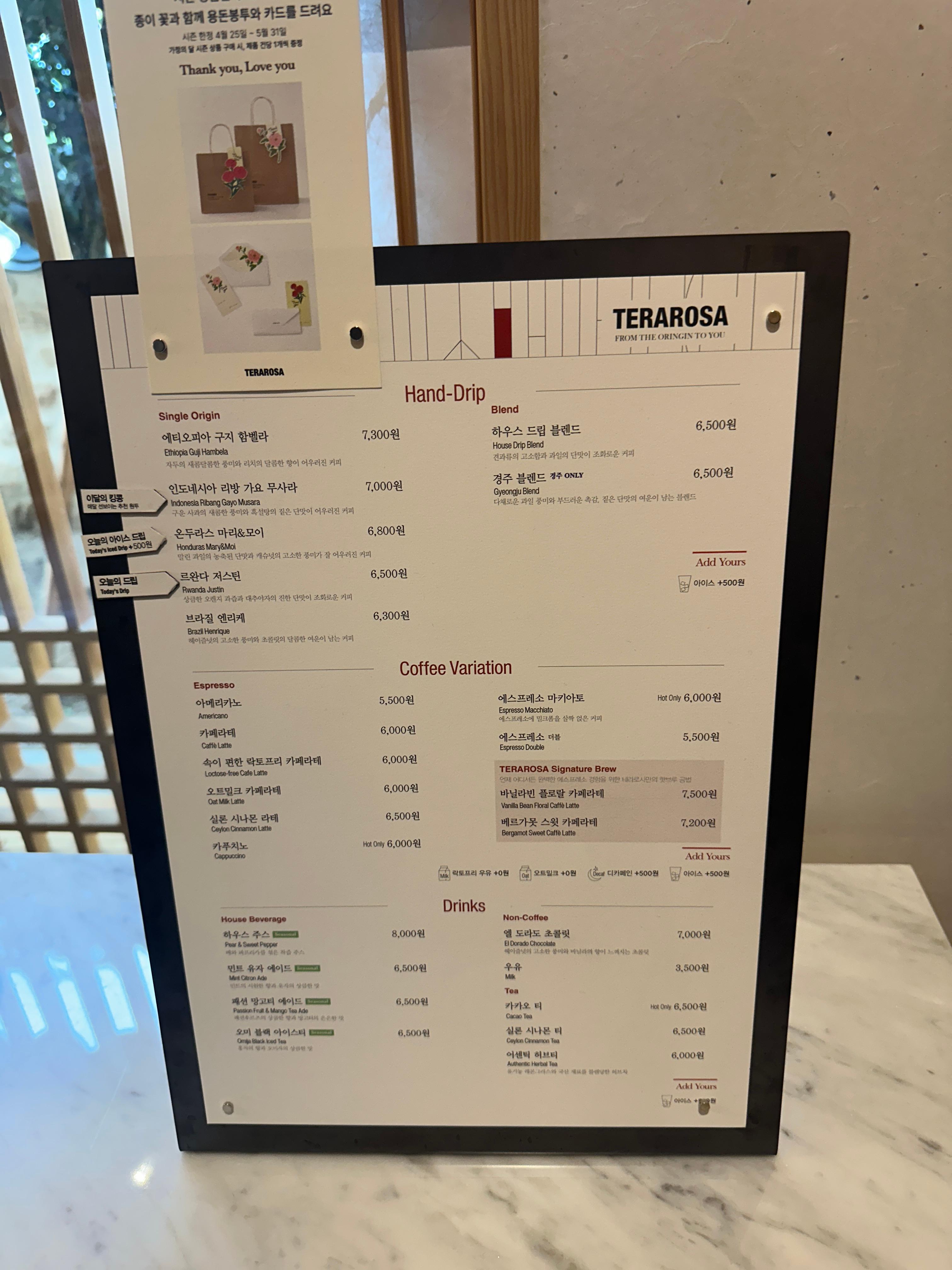 테라로사의 대표 메뉴인 핸드드립 커피는 다양한 원두를 선택할 수 있으며, 각 원두의 산지와 특징을 살려 풍부한 맛을 제공합니다.