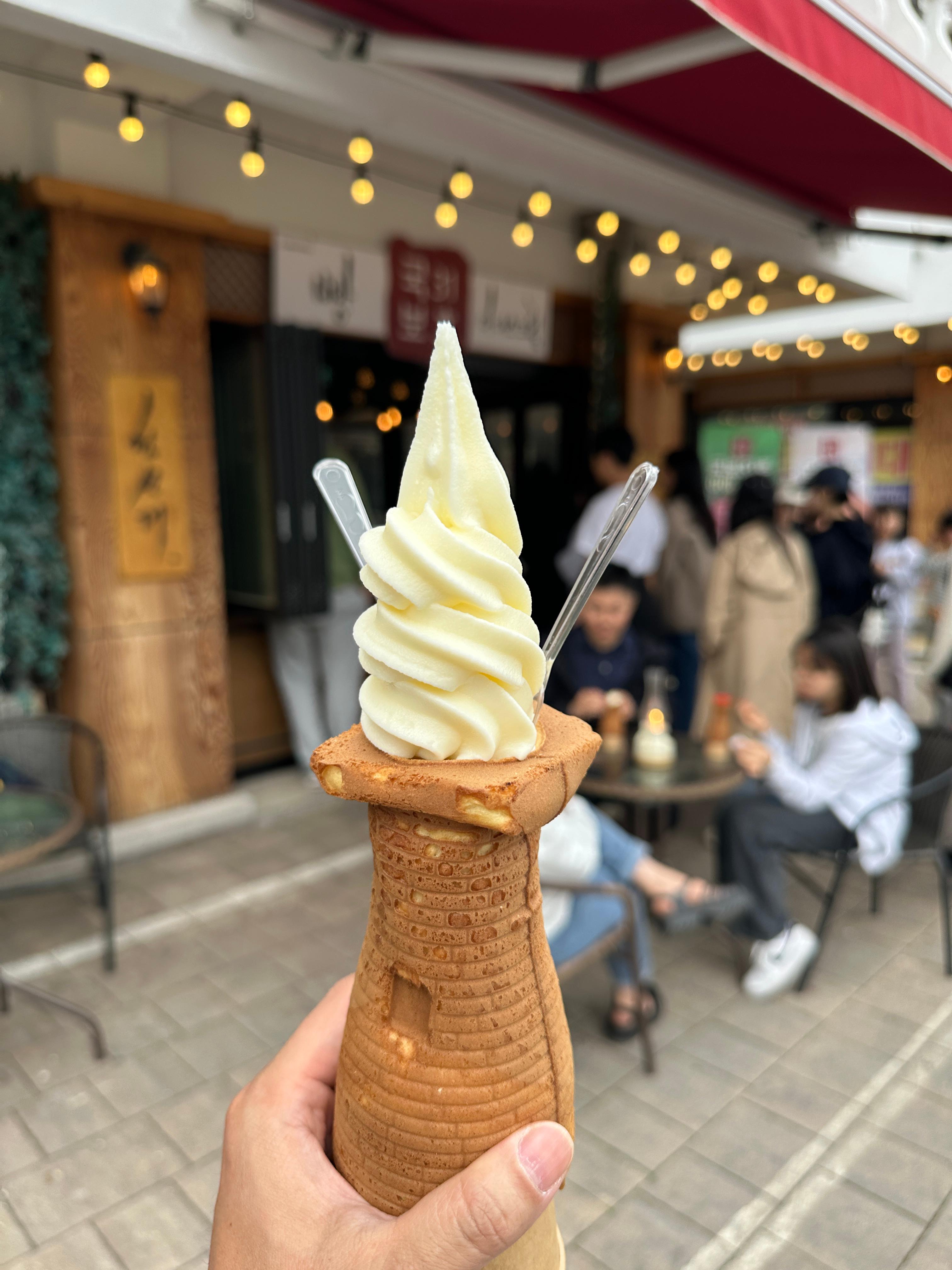 • 첨성대 아이스크림: 첨성대 모양의 빵에 상하목장 유기농 원유로 만든 소프트 아이스크림을 듬뿍 담은 디저트입니다. 딸기맛과 일반 소프트 아이스크림 두 가지 옵션이 있으며, 특히 딸기맛은 입술이 붉게 물들어 ‘신라멸망아이스크림’이라는 별칭으로도 불립니다. 음.. 상하목장 우유로 만들었다고 하는데, 같은 우유 제조사 걸로 만드는 폴바셋 아이스크림이랑은 느낌이 좀 차이가 났습니다.