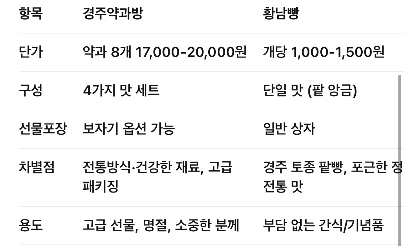 반면 황남빵은 가격이 저렴하고 누구나 부담 없이 즐길 수 있는 전통적 간식입니다. 즉, 정성 어린 선물이나 기념 의미를 담고 싶다면 경주약과방, 간단한 여행 기념이나 많은 인원에게 나눠주고 싶다면 황남빵이 좋겠네요.