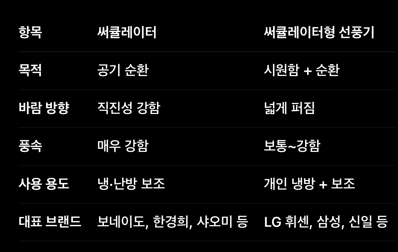 이제 점점 더워지면서 선풍기 구매나 써큘레이터 구매를 생각하시는 분들이 많을텐데요. 최근 써큘레이터형 선풍기라는게 생기면서 기존 싸큘레이터와는 뭐가 차이인지 궁금해졌어요. 그래서 알아보았습니다! 써큘레이터와 써큘레이터형 선풍기, 이름은 비슷하지만 목적과 성능에 분명한 차이가 있어요. 아래에 쉽게 비교해서 설명드릴게요.