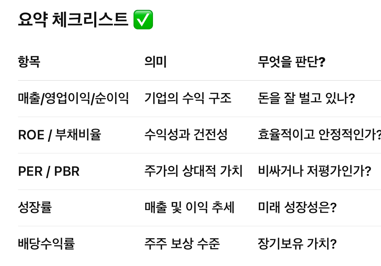 증권 투자에서 기업종합분석표(또는 기업개요/기업분석표)는 투자 판단의 기초 자료로 매우 중요합니다. 아래는 종합분석표에서 가장 기본적으로 확인해야 할 항목들과 그 의미를 정리한 것입니다. 이는 주식투자를 처음 접하는 투자자에게도 이해하기 쉽게 설명드릴게요.
