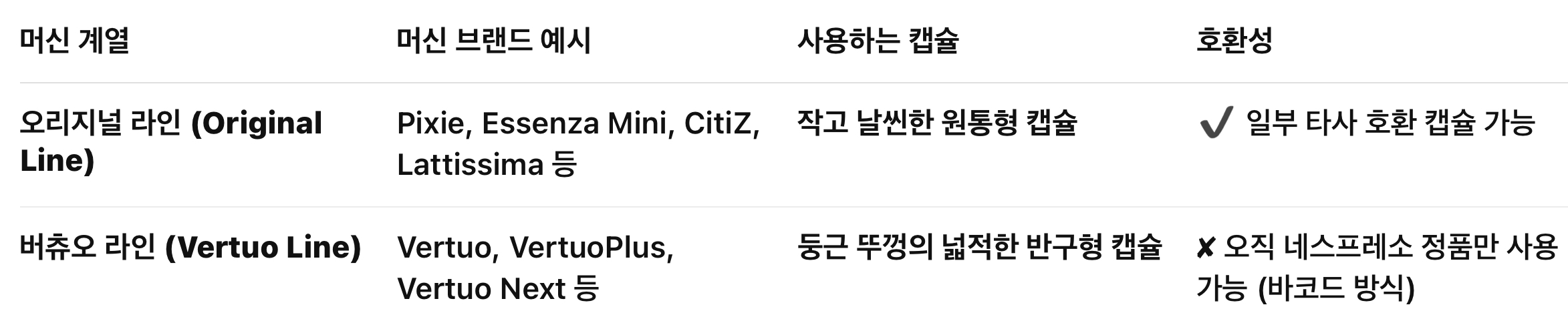 네스프레소는 머신 종류에 따라 사용하는 캡슐이 완전히 다르며, 호환되지 않습니다. 크게 보면 두 가지 계열로 나뉘며, 각각의 머신은 자기 계열 전용 캡슐만 사용 가능합니다.